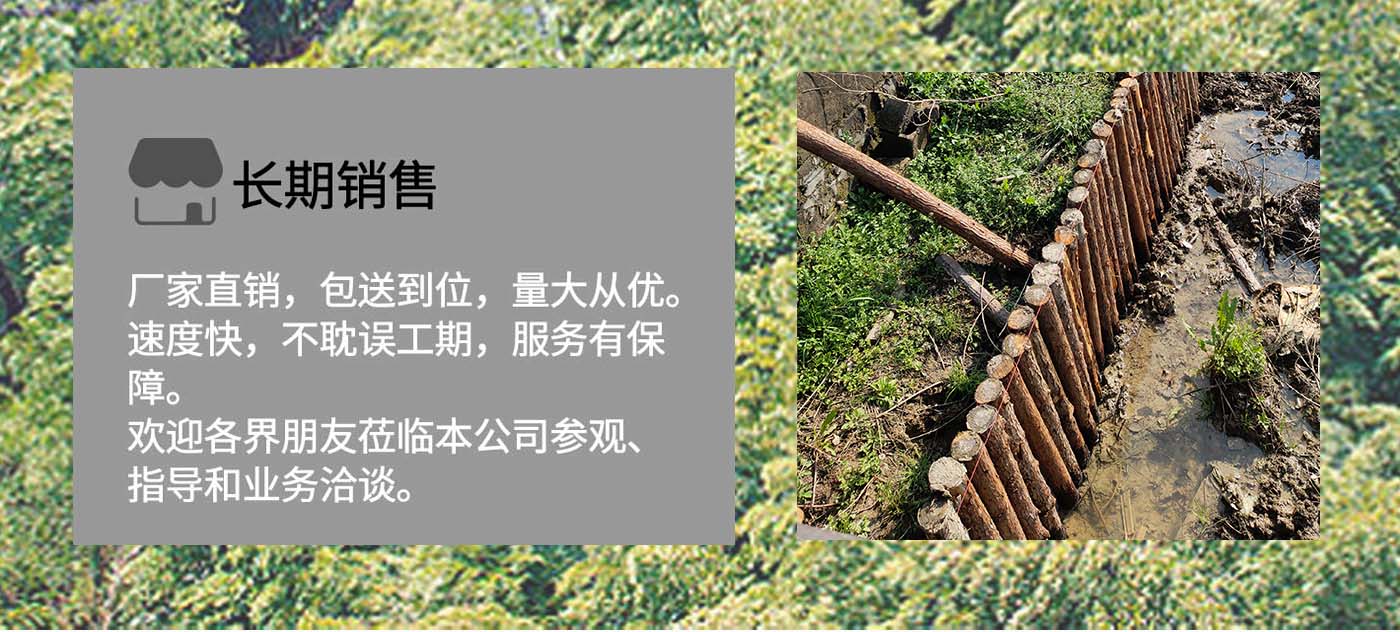 南京市云森木業(yè)有限公司位于南京市高淳區(qū)。是一家生產(chǎn)加工,線上銷售為一體的現(xiàn)代化企業(yè)。擁有完善、科學(xué)的質(zhì)量管理體系及工作團(tuán)隊(duì)。 公司主營(yíng)松木樁,杉木樁,打樁木,河道木樁,駁岸木樁,防汛木樁,景觀木樁、園林綠化支撐桿等,也可支持方料,木板等木材定制加工產(chǎn)品,所選原材料均為黃山中心林區(qū),樹齡均在三十年左右。質(zhì)地緊密,樹形優(yōu)美。 本公司貨源充足,供貨能力強(qiáng),地處高淳,交通方便利,江浙滬皖送貨上門,當(dāng)天可達(dá)。本著“誠(chéng)信為本,客戶至上”的經(jīng)營(yíng)宗旨,真誠(chéng)希望與您合作。 歡迎各位客戶前來(lái)咨詢,定以優(yōu)良品質(zhì)和價(jià)格回饋廣大客戶。